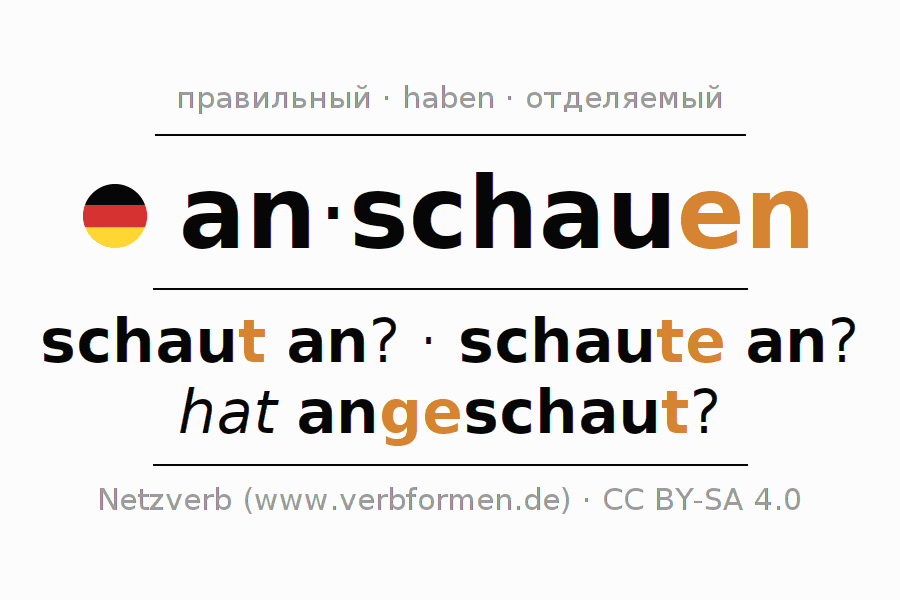 Примеры использования спряжения глаголов в anschauen. При этом речь идёт о реальных предложениях и о предложениях из проекта Tatoeba. Для каждой спряженной формы будет отображаться пример с таким предложением. Глагольная форма будет при этом выделена. Если имеется несколько предложений, будет случайным образом выбран пример с немецким глаголом anschauen. Чтобы понимать спряжение не только в примерах, но и в обучении, доступны листы с глаголом anschauen.