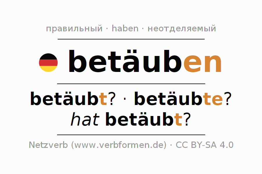 Примеры использования спряжения глаголов в betäuben. При этом речь идёт о реальных предложениях и о предложениях из проекта Tatoeba. Для каждой спряженной формы будет отображаться пример с таким предложением. Глагольная форма будет при этом выделена. Если имеется несколько предложений, будет случайным образом выбран пример с немецким глаголом betäuben. Чтобы понимать спряжение не только в примерах, но и в обучении, доступны листы с глаголом betäuben.