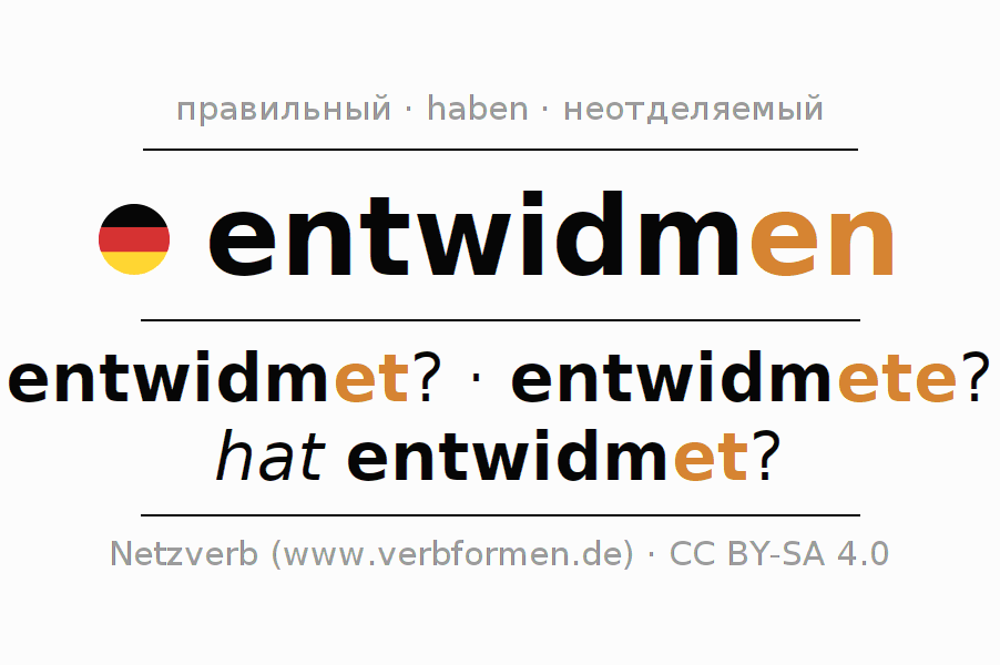 Примеры использования спряжения глаголов в entwidmen. При этом речь идёт о реальных предложениях и о предложениях из проекта Tatoeba. Для каждой спряженной формы будет отображаться пример с таким предложением. Глагольная форма будет при этом выделена. Если имеется несколько предложений, будет случайным образом выбран пример с немецким глаголом entwidmen. Чтобы понимать спряжение не только в примерах, но и в обучении, доступны листы с глаголом entwidmen.