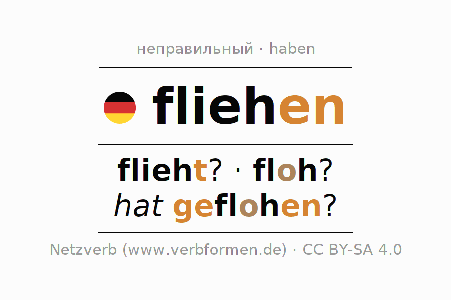 Примеры использования спряжения глаголов в fliehen. При этом речь идёт о реальных предложениях и о предложениях из проекта Tatoeba. Для каждой спряженной формы будет отображаться пример с таким предложением. Глагольная форма будет при этом выделена. Если имеется несколько предложений, будет случайным образом выбран пример с немецким глаголом fliehen (hat). Чтобы понимать спряжение не только в примерах, но и в обучении, доступны листы с глаголом fliehen.