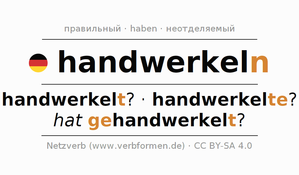 Примеры использования спряжения глаголов в handwerkeln. При этом речь идёт о реальных предложениях и о предложениях из проекта Tatoeba. Для каждой спряженной формы будет отображаться пример с таким предложением. Глагольная форма будет при этом выделена. Если имеется несколько предложений, будет случайным образом выбран пример с немецким глаголом handwerkeln. Чтобы понимать спряжение не только в примерах, но и в обучении, доступны листы с глаголом handwerkeln.