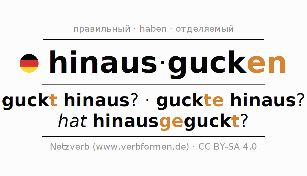 Примеры использования спряжения глаголов в hinausgucken. При этом речь идёт о реальных предложениях и о предложениях из проекта Tatoeba. Для каждой спряженной формы будет отображаться пример с таким предложением. Глагольная форма будет при этом выделена. Если имеется несколько предложений, будет случайным образом выбран пример с немецким глаголом hinausgucken. Чтобы понимать спряжение не только в примерах, но и в обучении, доступны листы с глаголом hinausgucken.