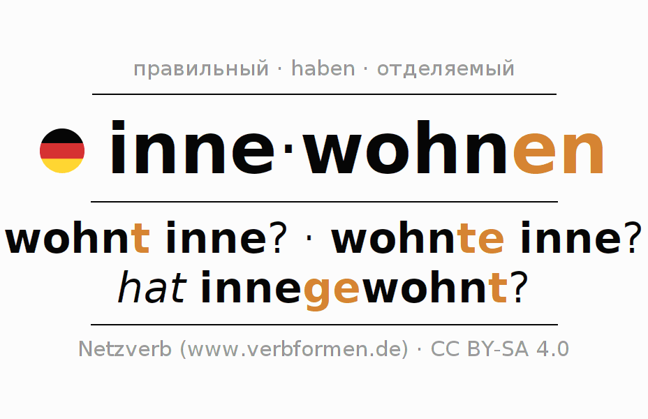 Примеры использования спряжения глаголов в innewohnen. При этом речь идёт о реальных предложениях и о предложениях из проекта Tatoeba. Для каждой спряженной формы будет отображаться пример с таким предложением. Глагольная форма будет при этом выделена. Если имеется несколько предложений, будет случайным образом выбран пример с немецким глаголом innewohnen. Чтобы понимать спряжение не только в примерах, но и в обучении, доступны листы с глаголом innewohnen.