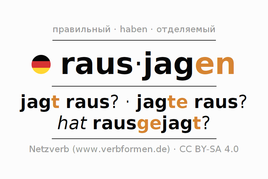 Примеры использования спряжения глаголов в rausjagen. При этом речь идёт о реальных предложениях и о предложениях из проекта Tatoeba. Для каждой спряженной формы будет отображаться пример с таким предложением. Глагольная форма будет при этом выделена. Если имеется несколько предложений, будет случайным образом выбран пример с немецким глаголом rausjagen. Чтобы понимать спряжение не только в примерах, но и в обучении, доступны листы с глаголом rausjagen.