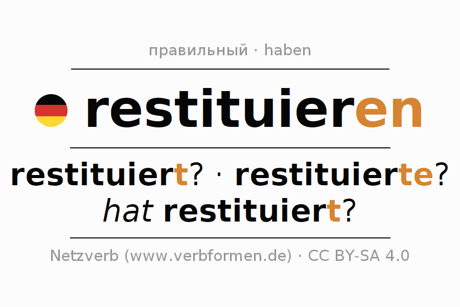 Примеры использования спряжения глаголов в restituieren. При этом речь идёт о реальных предложениях и о предложениях из проекта Tatoeba. Для каждой спряженной формы будет отображаться пример с таким предложением. Глагольная форма будет при этом выделена. Если имеется несколько предложений, будет случайным образом выбран пример с немецким глаголом restituieren. Чтобы понимать спряжение не только в примерах, но и в обучении, доступны листы с глаголом restituieren.