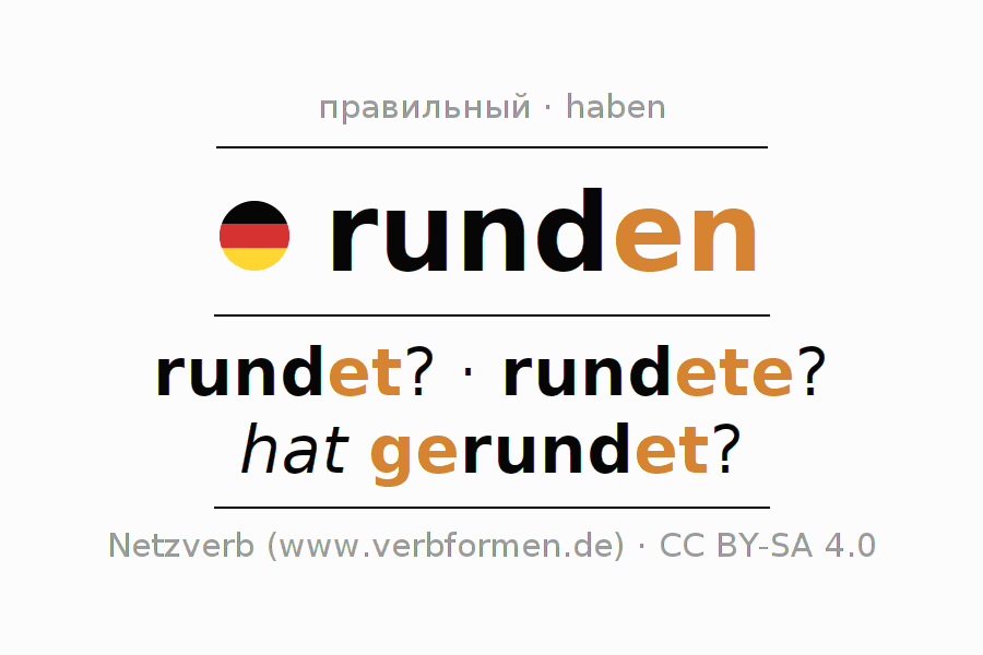 Примеры использования спряжения глаголов в runden. При этом речь идёт о реальных предложениях и о предложениях из проекта Tatoeba. Для каждой спряженной формы будет отображаться пример с таким предложением. Глагольная форма будет при этом выделена. Если имеется несколько предложений, будет случайным образом выбран пример с немецким глаголом runden. Чтобы понимать спряжение не только в примерах, но и в обучении, доступны листы с глаголом runden.