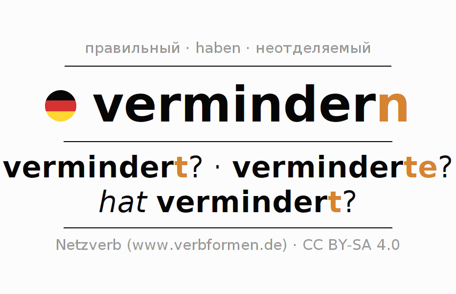 Примеры использования спряжения глаголов в vermindern. При этом речь идёт о реальных предложениях и о предложениях из проекта Tatoeba. Для каждой спряженной формы будет отображаться пример с таким предложением. Глагольная форма будет при этом выделена. Если имеется несколько предложений, будет случайным образом выбран пример с немецким глаголом vermindern. Чтобы понимать спряжение не только в примерах, но и в обучении, доступны листы с глаголом vermindern.