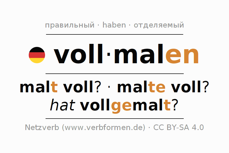 Примеры использования спряжения глаголов в vollmalen. При этом речь идёт о реальных предложениях и о предложениях из проекта Tatoeba. Для каждой спряженной формы будет отображаться пример с таким предложением. Глагольная форма будет при этом выделена. Если имеется несколько предложений, будет случайным образом выбран пример с немецким глаголом vollmalen. Чтобы понимать спряжение не только в примерах, но и в обучении, доступны листы с глаголом vollmalen.