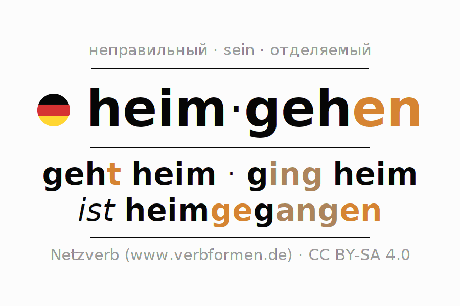 Примеры использования спряжения глаголов в heimgehen. При этом речь идёт о реальных предложениях и о предложениях из проекта Tatoeba. Для каждой спряженной формы будет отображаться пример с таким предложением. Глагольная форма будет при этом выделена. Если имеется несколько предложений, будет случайным образом выбран пример с немецким глаголом heimgehen. Чтобы понимать спряжение не только в примерах, но и в обучении, доступны листы с глаголом heimgehen.