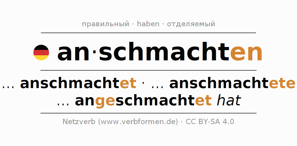Примеры использования спряжения глаголов в anschmachten. При этом речь идёт о реальных предложениях и о предложениях из проекта Tatoeba. Для каждой спряженной формы будет отображаться пример с таким предложением. Глагольная форма будет при этом выделена. Если имеется несколько предложений, будет случайным образом выбран пример с немецким глаголом anschmachten. Чтобы понимать спряжение не только в примерах, но и в обучении, доступны листы с глаголом anschmachten.