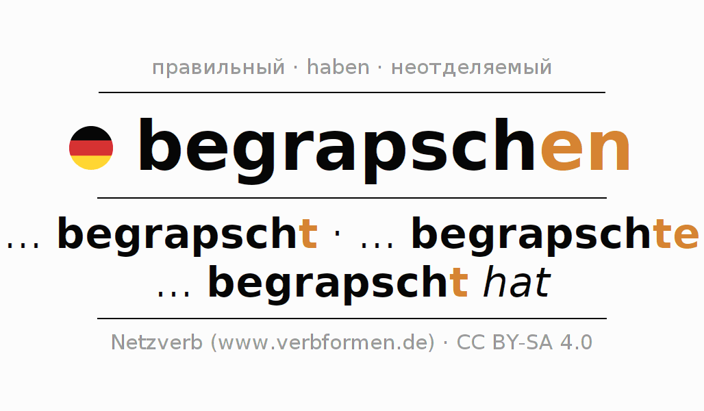 Примеры использования спряжения глаголов в begrapschen. При этом речь идёт о реальных предложениях и о предложениях из проекта Tatoeba. Для каждой спряженной формы будет отображаться пример с таким предложением. Глагольная форма будет при этом выделена. Если имеется несколько предложений, будет случайным образом выбран пример с немецким глаголом begrapschen. Чтобы понимать спряжение не только в примерах, но и в обучении, доступны листы с глаголом begrapschen.