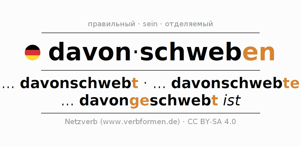 Примеры использования спряжения глаголов в davonschweben. При этом речь идёт о реальных предложениях и о предложениях из проекта Tatoeba. Для каждой спряженной формы будет отображаться пример с таким предложением. Глагольная форма будет при этом выделена. Если имеется несколько предложений, будет случайным образом выбран пример с немецким глаголом davonschweben. Чтобы понимать спряжение не только в примерах, но и в обучении, доступны листы с глаголом davonschweben.