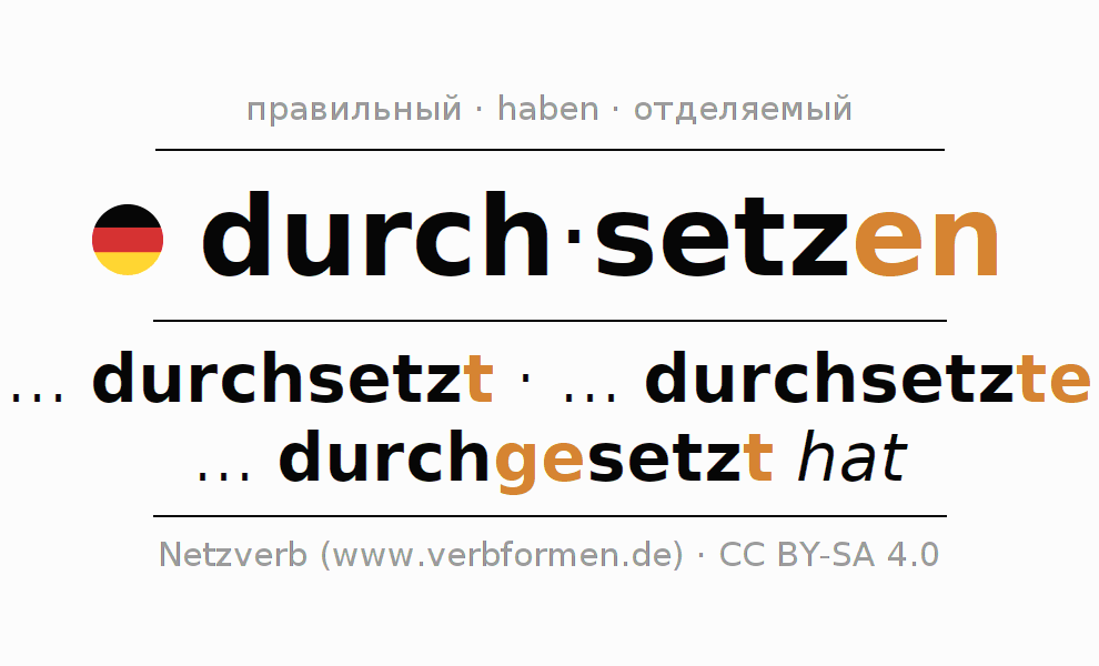 Примеры использования спряжения глаголов в durchsetzen. При этом речь идёт о реальных предложениях и о предложениях из проекта Tatoeba. Для каждой спряженной формы будет отображаться пример с таким предложением. Глагольная форма будет при этом выделена. Если имеется несколько предложений, будет случайным образом выбран пример с немецким глаголом durch-setzen. Чтобы понимать спряжение не только в примерах, но и в обучении, доступны листы с глаголом durchsetzen.