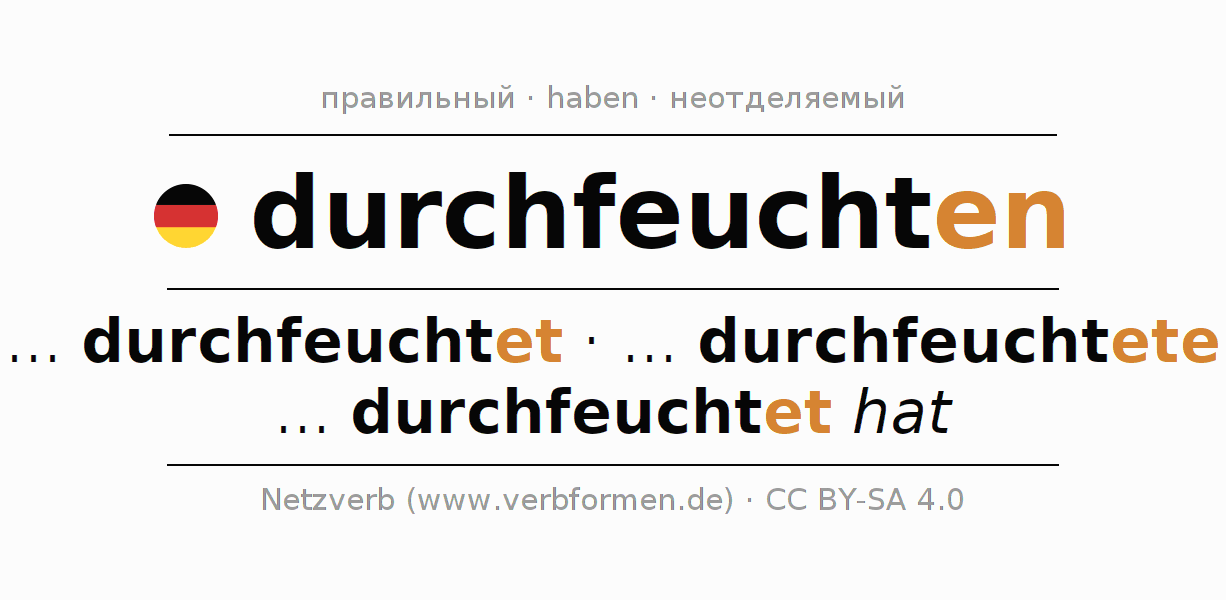 Примеры использования спряжения глаголов в durchfeuchten. При этом речь идёт о реальных предложениях и о предложениях из проекта Tatoeba. Для каждой спряженной формы будет отображаться пример с таким предложением. Глагольная форма будет при этом выделена. Если имеется несколько предложений, будет случайным образом выбран пример с немецким глаголом durchfeuchten. Чтобы понимать спряжение не только в примерах, но и в обучении, доступны листы с глаголом durchfeuchten.