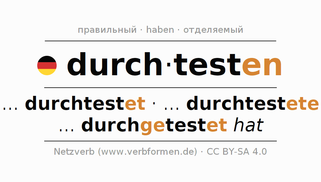 Примеры использования спряжения глаголов в durchtesten. При этом речь идёт о реальных предложениях и о предложениях из проекта Tatoeba. Для каждой спряженной формы будет отображаться пример с таким предложением. Глагольная форма будет при этом выделена. Если имеется несколько предложений, будет случайным образом выбран пример с немецким глаголом durchtesten. Чтобы понимать спряжение не только в примерах, но и в обучении, доступны листы с глаголом durchtesten.