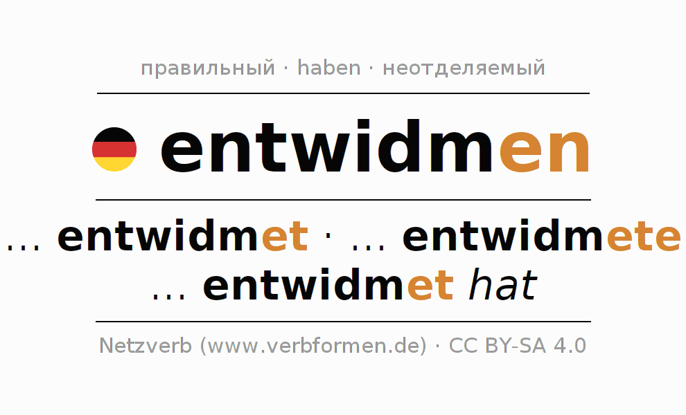 Примеры использования спряжения глаголов в entwidmen. При этом речь идёт о реальных предложениях и о предложениях из проекта Tatoeba. Для каждой спряженной формы будет отображаться пример с таким предложением. Глагольная форма будет при этом выделена. Если имеется несколько предложений, будет случайным образом выбран пример с немецким глаголом entwidmen. Чтобы понимать спряжение не только в примерах, но и в обучении, доступны листы с глаголом entwidmen.