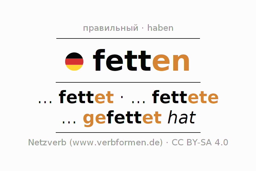 Примеры использования спряжения глаголов в fetten. При этом речь идёт о реальных предложениях и о предложениях из проекта Tatoeba. Для каждой спряженной формы будет отображаться пример с таким предложением. Глагольная форма будет при этом выделена. Если имеется несколько предложений, будет случайным образом выбран пример с немецким глаголом fetten. Чтобы понимать спряжение не только в примерах, но и в обучении, доступны листы с глаголом fetten.