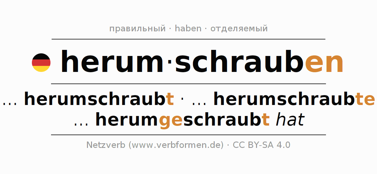 Примеры использования спряжения глаголов в herumschrauben. При этом речь идёт о реальных предложениях и о предложениях из проекта Tatoeba. Для каждой спряженной формы будет отображаться пример с таким предложением. Глагольная форма будет при этом выделена. Если имеется несколько предложений, будет случайным образом выбран пример с немецким глаголом herumschrauben. Чтобы понимать спряжение не только в примерах, но и в обучении, доступны листы с глаголом herumschrauben.