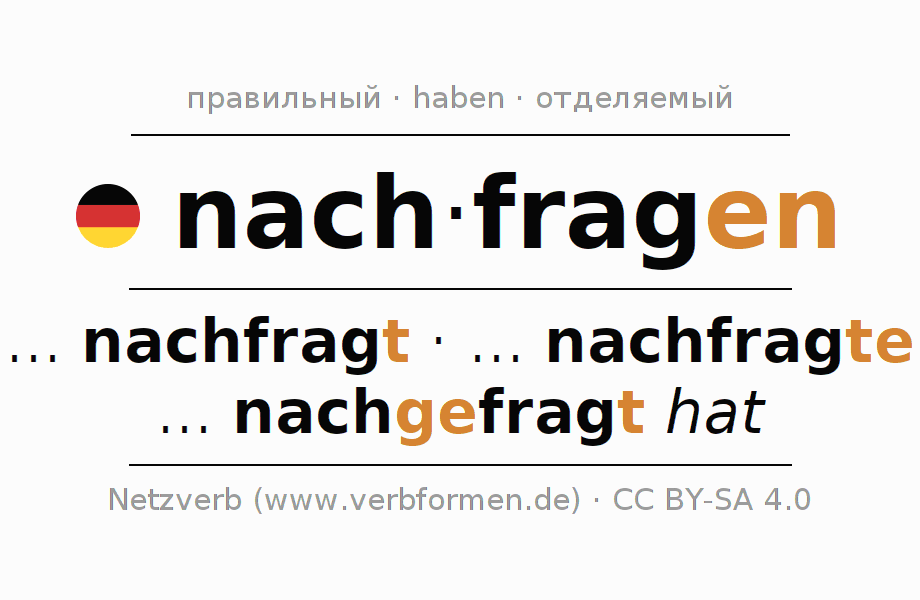 Примеры использования спряжения глаголов в nachfragen. При этом речь идёт о реальных предложениях и о предложениях из проекта Tatoeba. Для каждой спряженной формы будет отображаться пример с таким предложением. Глагольная форма будет при этом выделена. Если имеется несколько предложений, будет случайным образом выбран пример с немецким глаголом nachfragen (regelm). Чтобы понимать спряжение не только в примерах, но и в обучении, доступны листы с глаголом nachfragen.