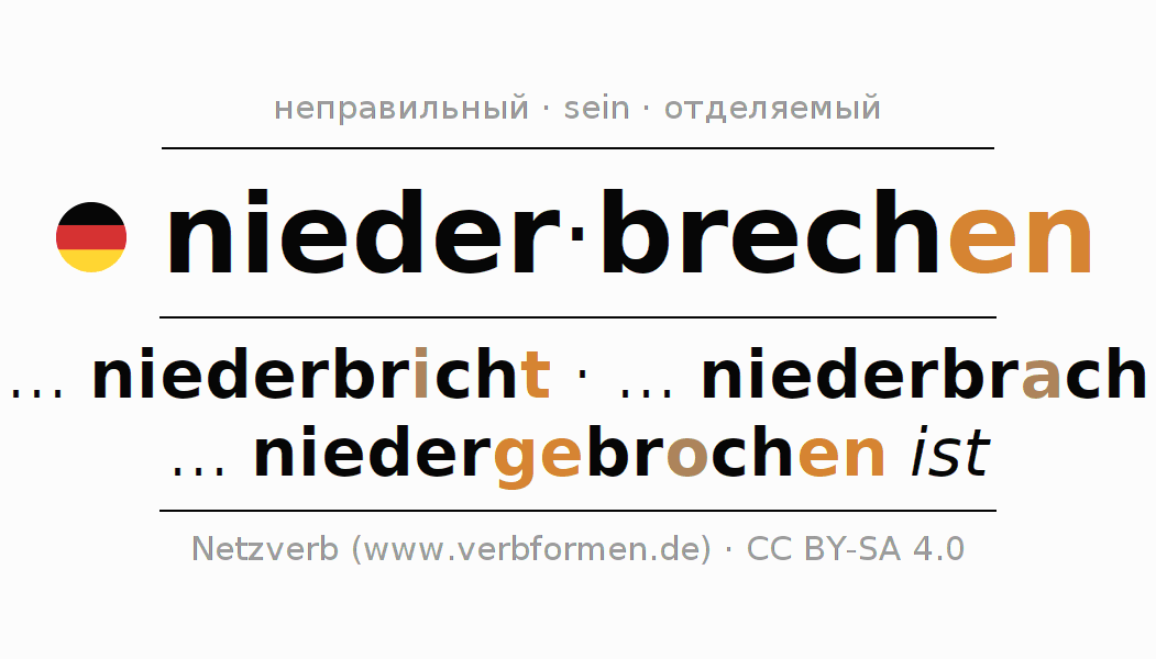 Примеры использования спряжения глаголов в niederbrechen. При этом речь идёт о реальных предложениях и о предложениях из проекта Tatoeba. Для каждой спряженной формы будет отображаться пример с таким предложением. Глагольная форма будет при этом выделена. Если имеется несколько предложений, будет случайным образом выбран пример с немецким глаголом niederbrechen (ist). Чтобы понимать спряжение не только в примерах, но и в обучении, доступны листы с глаголом niederbrechen.