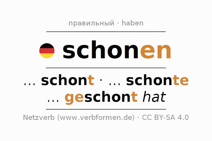 Примеры использования спряжения глаголов в schonen. При этом речь идёт о реальных предложениях и о предложениях из проекта Tatoeba. Для каждой спряженной формы будет отображаться пример с таким предложением. Глагольная форма будет при этом выделена. Если имеется несколько предложений, будет случайным образом выбран пример с немецким глаголом schonen. Чтобы понимать спряжение не только в примерах, но и в обучении, доступны листы с глаголом schonen.
