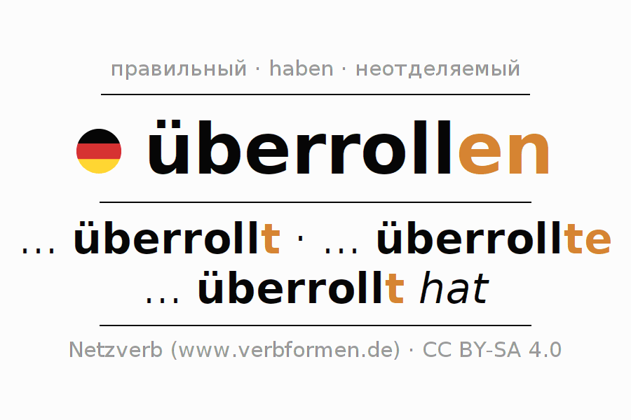 Примеры использования спряжения глаголов в überrollen. При этом речь идёт о реальных предложениях и о предложениях из проекта Tatoeba. Для каждой спряженной формы будет отображаться пример с таким предложением. Глагольная форма будет при этом выделена. Если имеется несколько предложений, будет случайным образом выбран пример с немецким глаголом überrollen. Чтобы понимать спряжение не только в примерах, но и в обучении, доступны листы с глаголом überrollen.