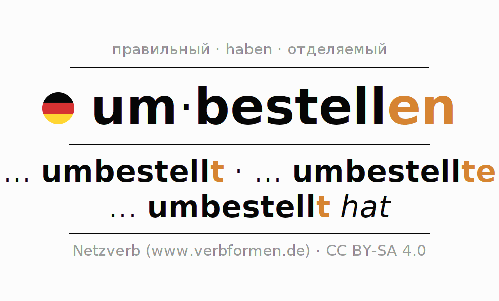 Примеры использования спряжения глаголов в umbestellen. При этом речь идёт о реальных предложениях и о предложениях из проекта Tatoeba. Для каждой спряженной формы будет отображаться пример с таким предложением. Глагольная форма будет при этом выделена. Если имеется несколько предложений, будет случайным образом выбран пример с немецким глаголом umbestellen. Чтобы понимать спряжение не только в примерах, но и в обучении, доступны листы с глаголом umbestellen.