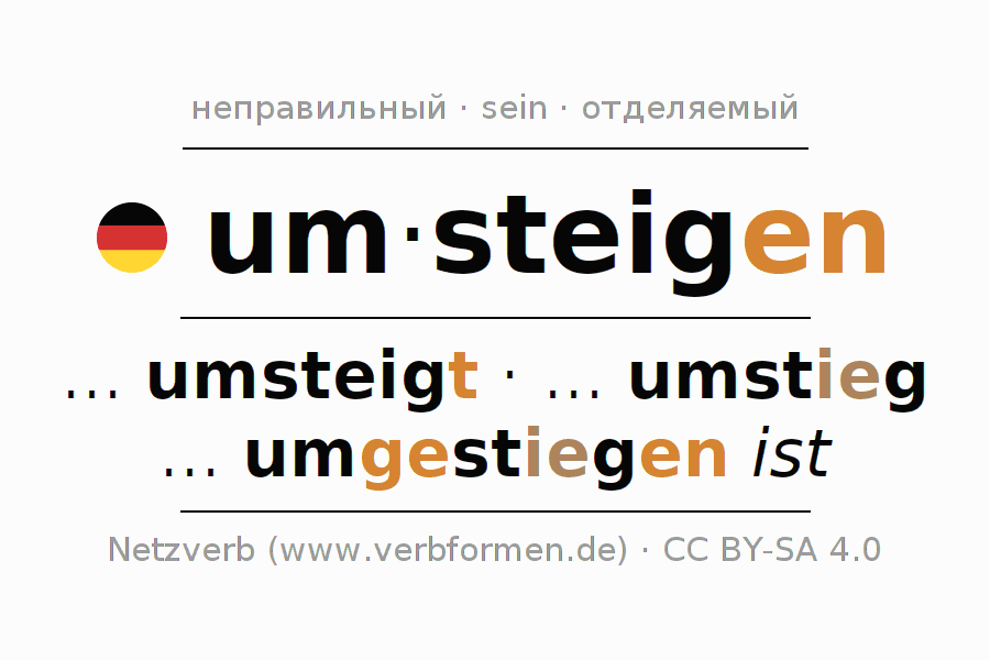 Примеры использования спряжения глаголов в umsteigen. При этом речь идёт о реальных предложениях и о предложениях из проекта Tatoeba. Для каждой спряженной формы будет отображаться пример с таким предложением. Глагольная форма будет при этом выделена. Если имеется несколько предложений, будет случайным образом выбран пример с немецким глаголом umsteigen. Чтобы понимать спряжение не только в примерах, но и в обучении, доступны листы с глаголом umsteigen.
