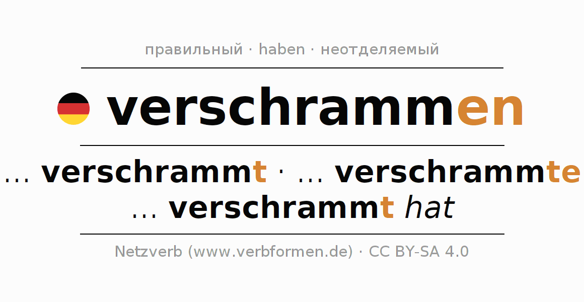 Примеры использования спряжения глаголов в verschrammen. При этом речь идёт о реальных предложениях и о предложениях из проекта Tatoeba. Для каждой спряженной формы будет отображаться пример с таким предложением. Глагольная форма будет при этом выделена. Если имеется несколько предложений, будет случайным образом выбран пример с немецким глаголом verschrammen (hat). Чтобы понимать спряжение не только в примерах, но и в обучении, доступны листы с глаголом verschrammen.