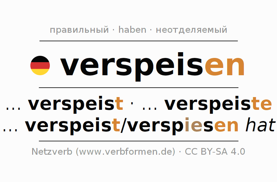 Примеры использования спряжения глаголов в verspeisen. При этом речь идёт о реальных предложениях и о предложениях из проекта Tatoeba. Для каждой спряженной формы будет отображаться пример с таким предложением. Глагольная форма будет при этом выделена. Если имеется несколько предложений, будет случайным образом выбран пример с немецким глаголом verspeisen. Чтобы понимать спряжение не только в примерах, но и в обучении, доступны листы с глаголом verspeisen.