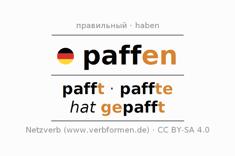 Примеры использования спряжения глаголов в paffen. При этом речь идёт о реальных предложениях и о предложениях из проекта Tatoeba. Для каждой спряженной формы будет отображаться пример с таким предложением. Глагольная форма будет при этом выделена. Если имеется несколько предложений, будет случайным образом выбран пример с немецким глаголом paffen. Чтобы понимать спряжение не только в примерах, но и в обучении, доступны листы с глаголом paffen.