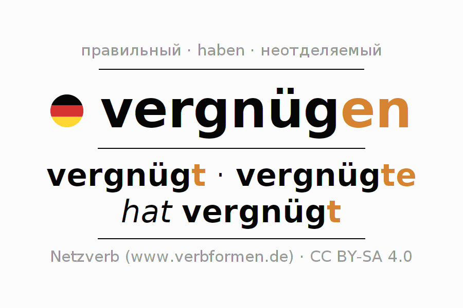 Примеры использования спряжения глаголов в vergnügen. При этом речь идёт о реальных предложениях и о предложениях из проекта Tatoeba. Для каждой спряженной формы будет отображаться пример с таким предложением. Глагольная форма будет при этом выделена. Если имеется несколько предложений, будет случайным образом выбран пример с немецким глаголом vergnügen. Чтобы понимать спряжение не только в примерах, но и в обучении, доступны листы с глаголом vergnügen.