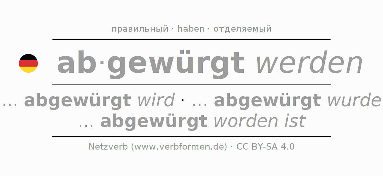 Примеры использования спряжения глаголов в abwürgen. При этом речь идёт о реальных предложениях и о предложениях из проекта Tatoeba. Для каждой спряженной формы будет отображаться пример с таким предложением. Глагольная форма будет при этом выделена. Если имеется несколько предложений, будет случайным образом выбран пример с немецким глаголом abwürgen. Чтобы понимать спряжение не только в примерах, но и в обучении, доступны листы с глаголом abwürgen.