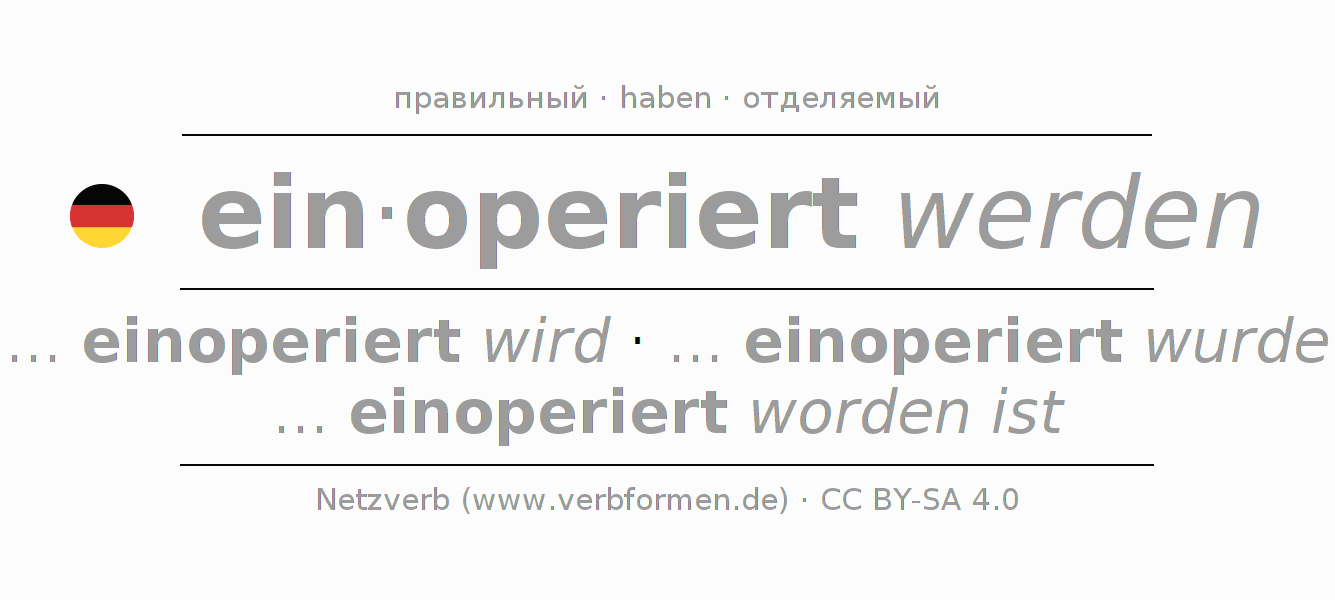 Примеры использования спряжения глаголов в einoperieren. При этом речь идёт о реальных предложениях и о предложениях из проекта Tatoeba. Для каждой спряженной формы будет отображаться пример с таким предложением. Глагольная форма будет при этом выделена. Если имеется несколько предложений, будет случайным образом выбран пример с немецким глаголом einoperieren. Чтобы понимать спряжение не только в примерах, но и в обучении, доступны листы с глаголом einoperieren.