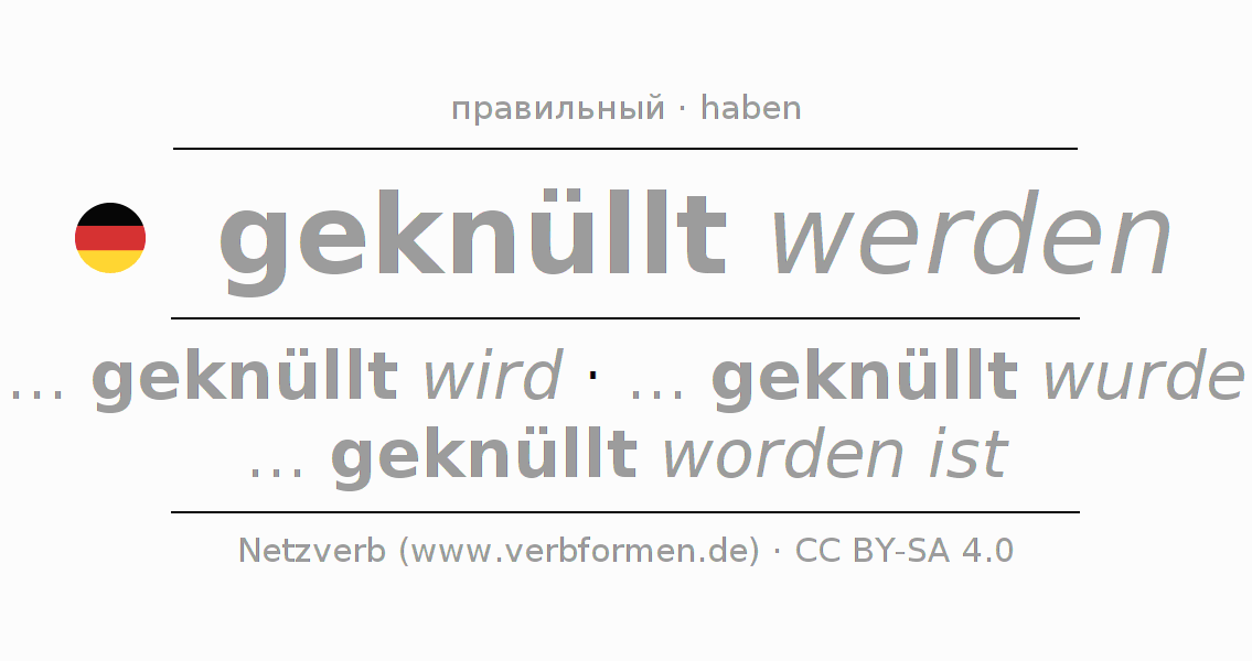 Примеры использования спряжения глаголов в knüllen. При этом речь идёт о реальных предложениях и о предложениях из проекта Tatoeba. Для каждой спряженной формы будет отображаться пример с таким предложением. Глагольная форма будет при этом выделена. Если имеется несколько предложений, будет случайным образом выбран пример с немецким глаголом knüllen. Чтобы понимать спряжение не только в примерах, но и в обучении, доступны листы с глаголом knüllen.