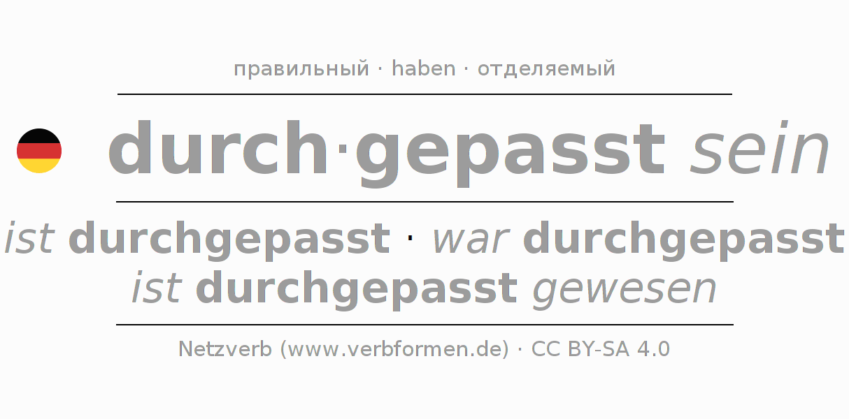 Примеры использования спряжения глаголов в durchpassen. При этом речь идёт о реальных предложениях и о предложениях из проекта Tatoeba. Для каждой спряженной формы будет отображаться пример с таким предложением. Глагольная форма будет при этом выделена. Если имеется несколько предложений, будет случайным образом выбран пример с немецким глаголом durchpassen. Чтобы понимать спряжение не только в примерах, но и в обучении, доступны листы с глаголом durchpassen.