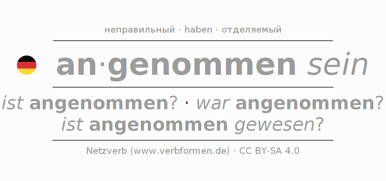 Примеры использования спряжения глаголов в annehmen. При этом речь идёт о реальных предложениях и о предложениях из проекта Tatoeba. Для каждой спряженной формы будет отображаться пример с таким предложением. Глагольная форма будет при этом выделена. Если имеется несколько предложений, будет случайным образом выбран пример с немецким глаголом annehmen. Чтобы понимать спряжение не только в примерах, но и в обучении, доступны листы с глаголом annehmen.