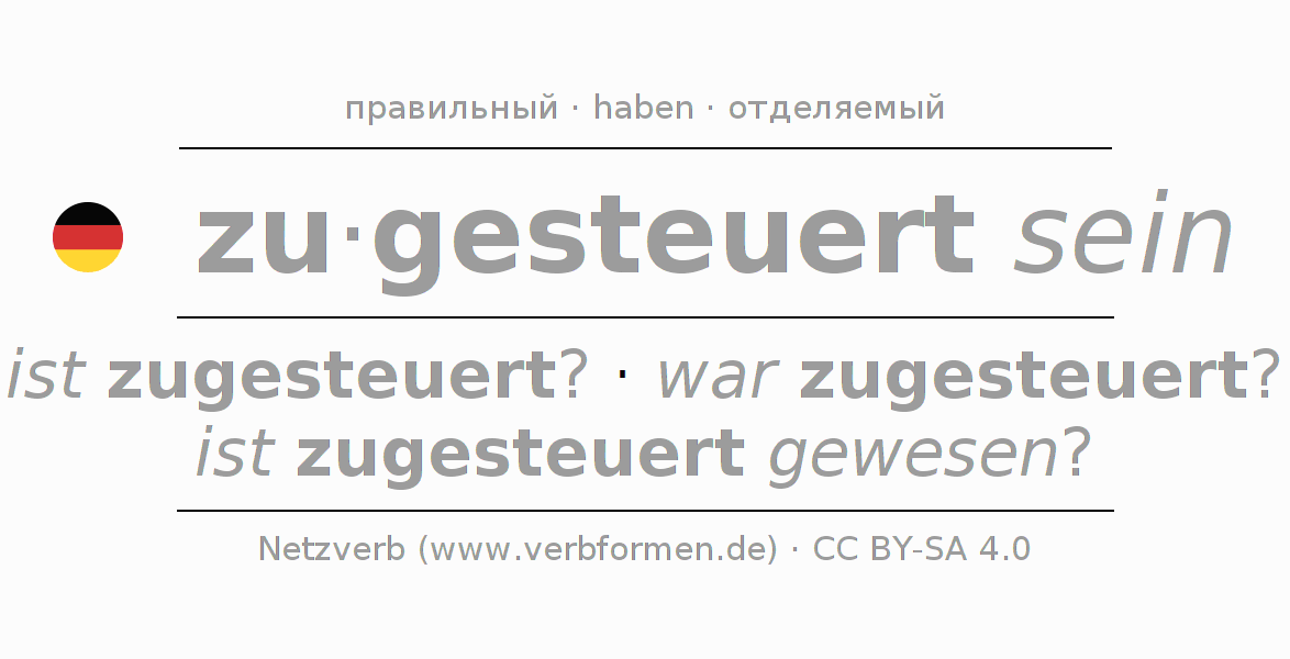 Примеры использования спряжения глаголов в zusteuern. При этом речь идёт о реальных предложениях и о предложениях из проекта Tatoeba. Для каждой спряженной формы будет отображаться пример с таким предложением. Глагольная форма будет при этом выделена. Если имеется несколько предложений, будет случайным образом выбран пример с немецким глаголом zusteuern (hat). Чтобы понимать спряжение не только в примерах, но и в обучении, доступны листы с глаголом zusteuern.
