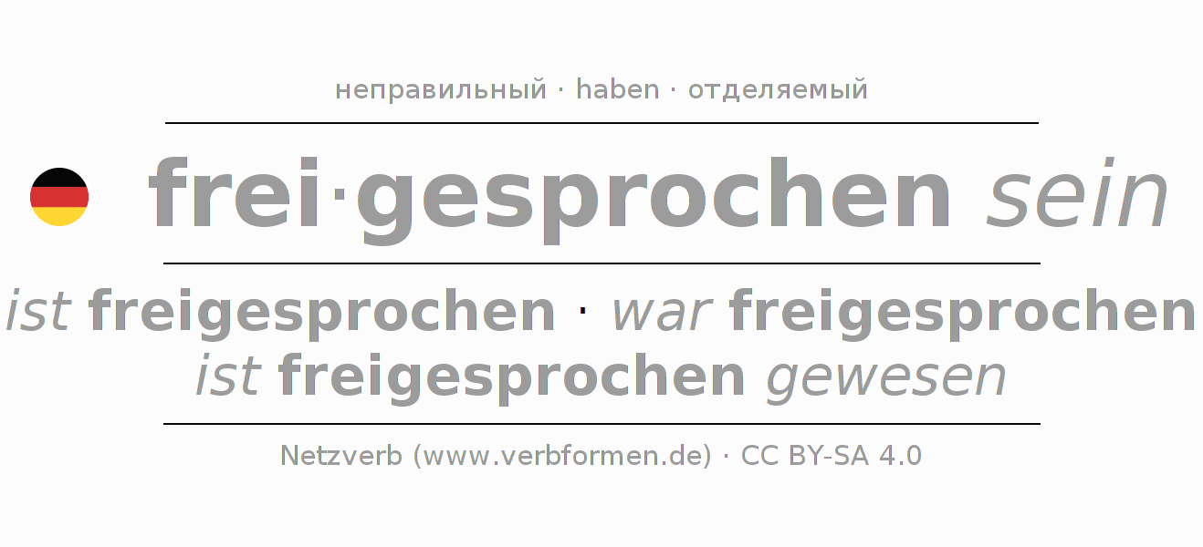 Примеры использования спряжения глаголов в freisprechen. При этом речь идёт о реальных предложениях и о предложениях из проекта Tatoeba. Для каждой спряженной формы будет отображаться пример с таким предложением. Глагольная форма будет при этом выделена. Если имеется несколько предложений, будет случайным образом выбран пример с немецким глаголом freisprechen. Чтобы понимать спряжение не только в примерах, но и в обучении, доступны листы с глаголом freisprechen.