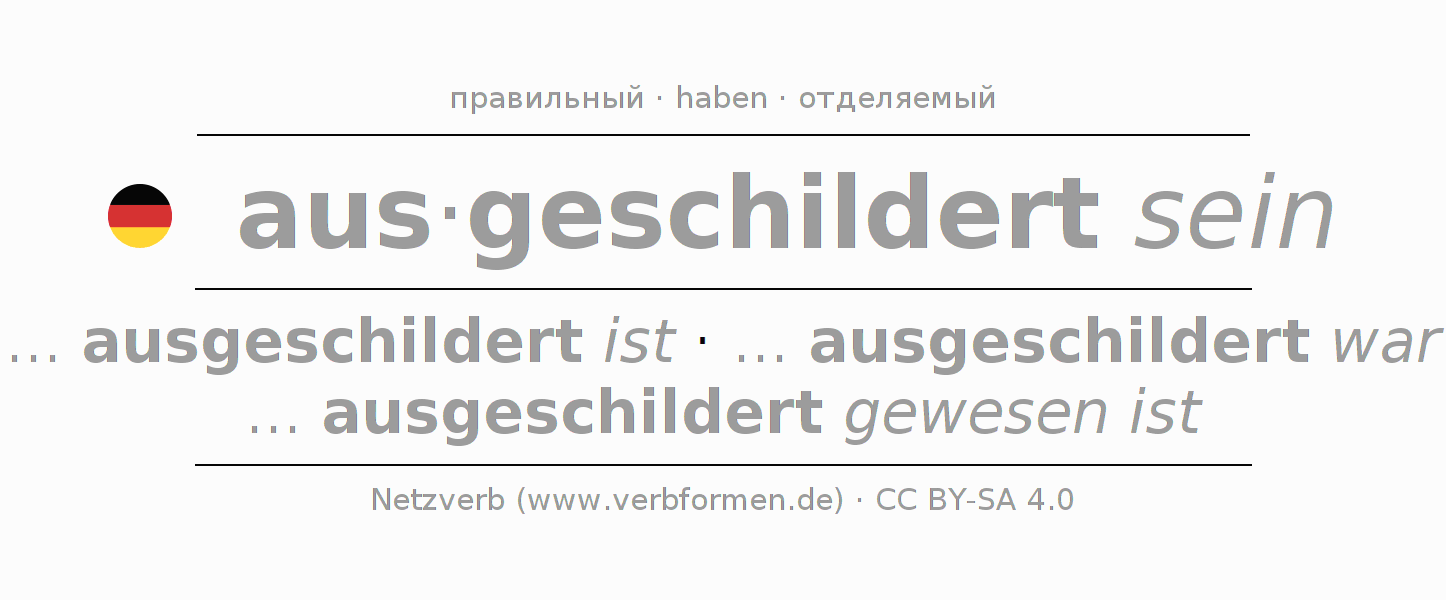 Примеры использования спряжения глаголов в ausschildern. При этом речь идёт о реальных предложениях и о предложениях из проекта Tatoeba. Для каждой спряженной формы будет отображаться пример с таким предложением. Глагольная форма будет при этом выделена. Если имеется несколько предложений, будет случайным образом выбран пример с немецким глаголом ausschildern. Чтобы понимать спряжение не только в примерах, но и в обучении, доступны листы с глаголом ausschildern.