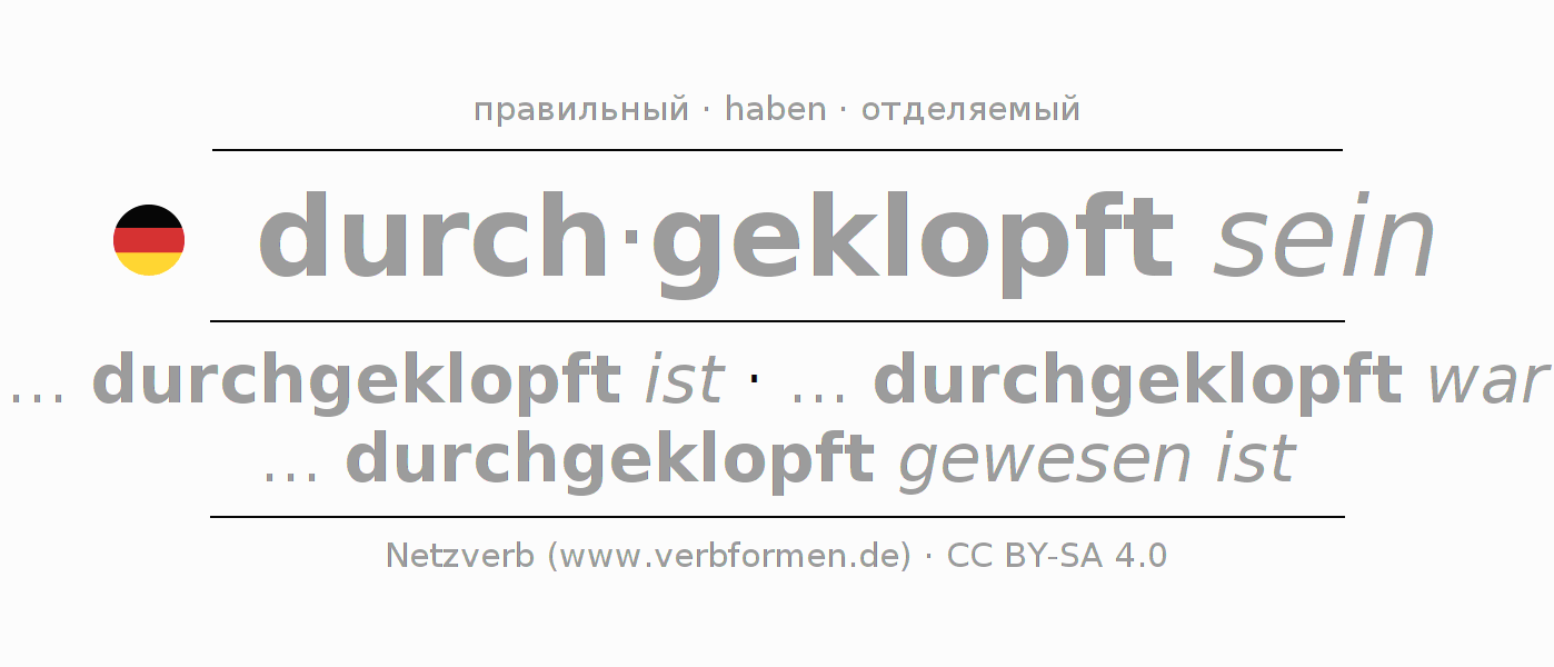 Примеры использования спряжения глаголов в durchklopfen. При этом речь идёт о реальных предложениях и о предложениях из проекта Tatoeba. Для каждой спряженной формы будет отображаться пример с таким предложением. Глагольная форма будет при этом выделена. Если имеется несколько предложений, будет случайным образом выбран пример с немецким глаголом durchklopfen. Чтобы понимать спряжение не только в примерах, но и в обучении, доступны листы с глаголом durchklopfen.