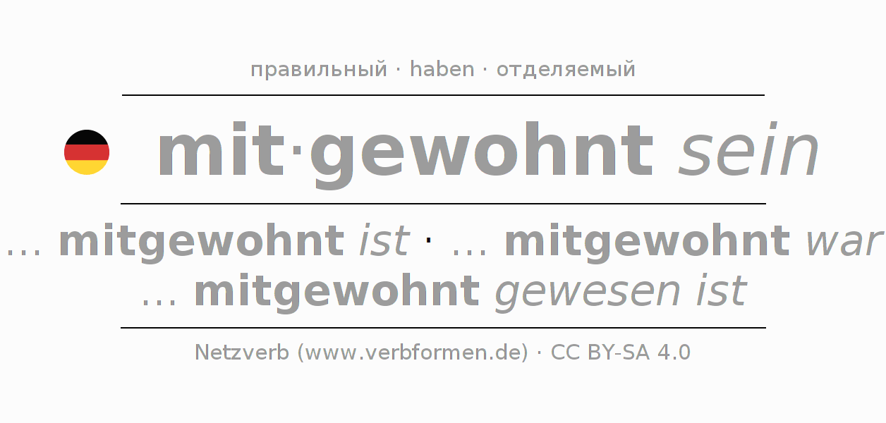 Примеры использования спряжения глаголов в mitwohnen. При этом речь идёт о реальных предложениях и о предложениях из проекта Tatoeba. Для каждой спряженной формы будет отображаться пример с таким предложением. Глагольная форма будет при этом выделена. Если имеется несколько предложений, будет случайным образом выбран пример с немецким глаголом mitwohnen. Чтобы понимать спряжение не только в примерах, но и в обучении, доступны листы с глаголом mitwohnen.