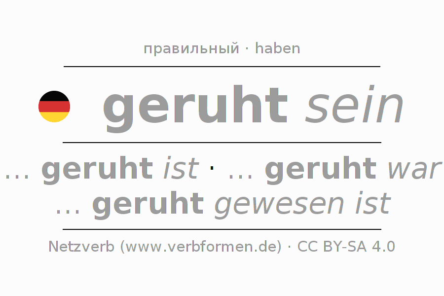 Примеры использования спряжения глаголов в ruhen. При этом речь идёт о реальных предложениях и о предложениях из проекта Tatoeba. Для каждой спряженной формы будет отображаться пример с таким предложением. Глагольная форма будет при этом выделена. Если имеется несколько предложений, будет случайным образом выбран пример с немецким глаголом ruhen. Чтобы понимать спряжение не только в примерах, но и в обучении, доступны листы с глаголом ruhen.