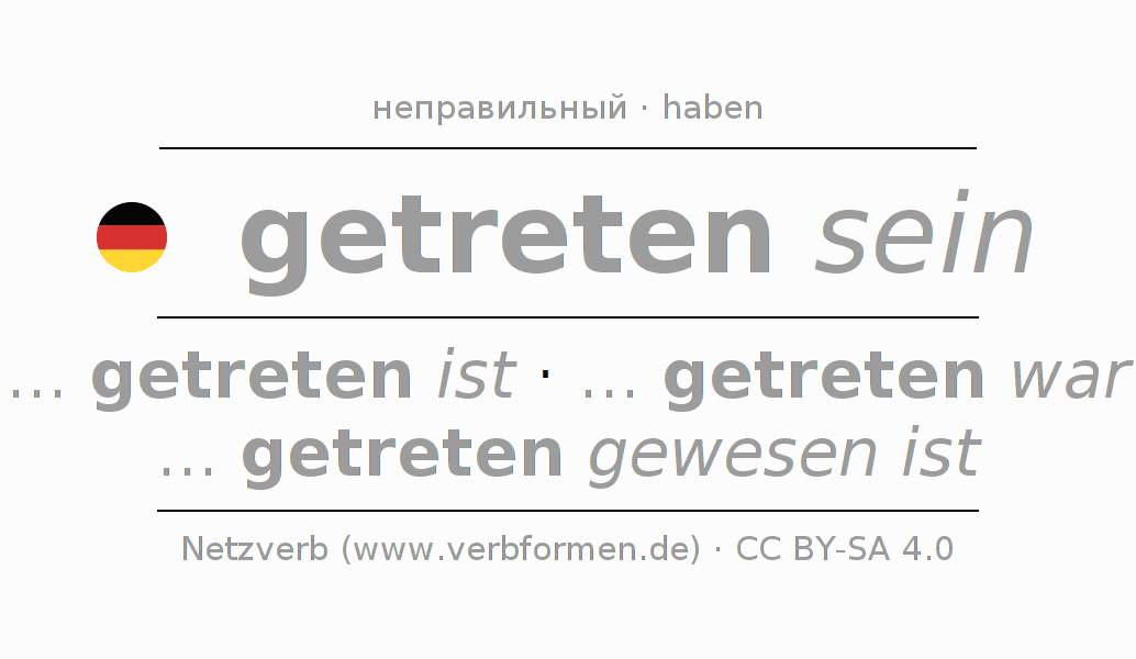 Примеры использования спряжения глаголов в treten. При этом речь идёт о реальных предложениях и о предложениях из проекта Tatoeba. Для каждой спряженной формы будет отображаться пример с таким предложением. Глагольная форма будет при этом выделена. Если имеется несколько предложений, будет случайным образом выбран пример с немецким глаголом treten (hat). Чтобы понимать спряжение не только в примерах, но и в обучении, доступны листы с глаголом treten.