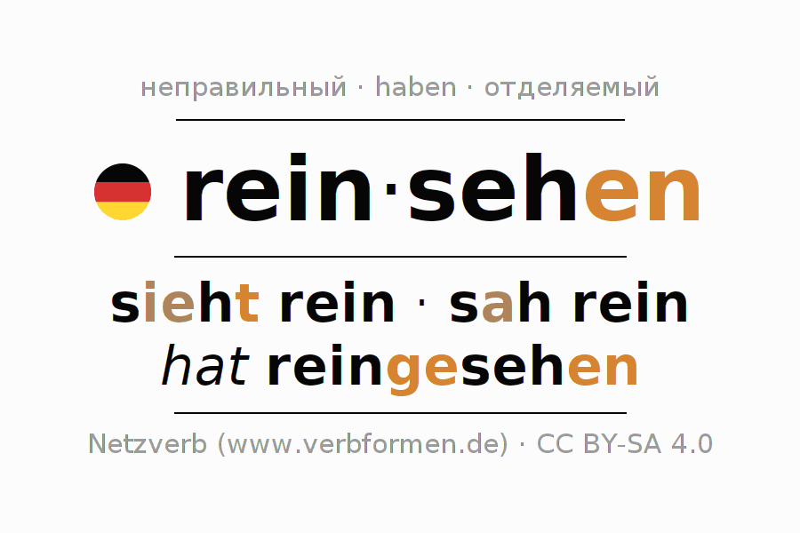 - Презенс: ich seh(e) rein, du siehst rein, er sieht rein, wir seh(e)n rein, ihr seht rein, sie seh(e)n rein