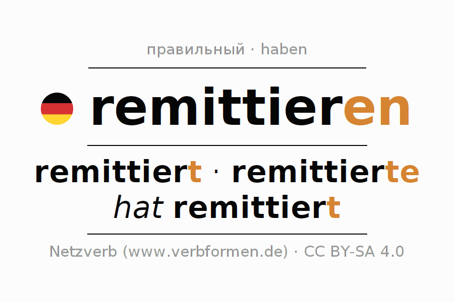 - Презенс: remittier(e) (du), remittieren wir, remittiert (ihr), remittieren Sie