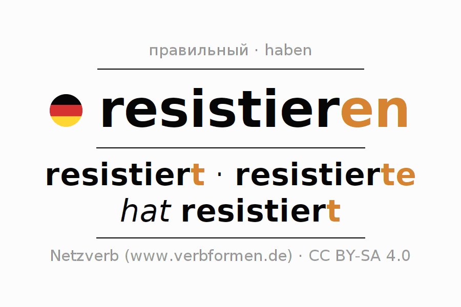 - Презенс: resistier(e) (du), resistieren wir, resistiert (ihr), resistieren Sie
