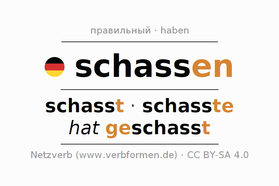 - Презенс: ich schasse, du schassest, er schasse, wir schassen, ihr schasset, sie schassen