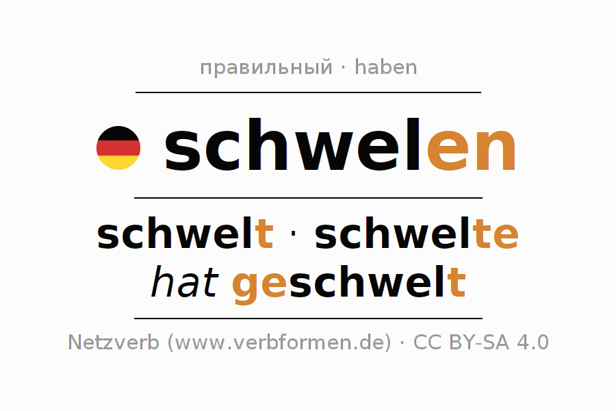 Глагол 'schwelen' онлайн как таблица глаголов со всеми наглядно представленными формами. Значение глагола schwelen таким образом является помощью для выполнения домашних заданий; подготовки к экзаменам и контрольным работам, а также к урокам немецкого языка; для обучения в вузах и при получении образования для взрослых. Именно для изучающих немецкий язык – правильное спряжение глаголов (schwelt - schwelte - hat geschwelt) является решающим фактором.