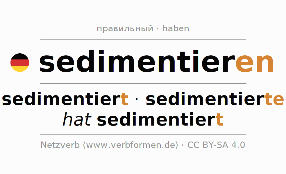 Глагол sedimentieren спрягается в индикативе Действительный залог (актив) в настоящем, прошедшем и будущем времени